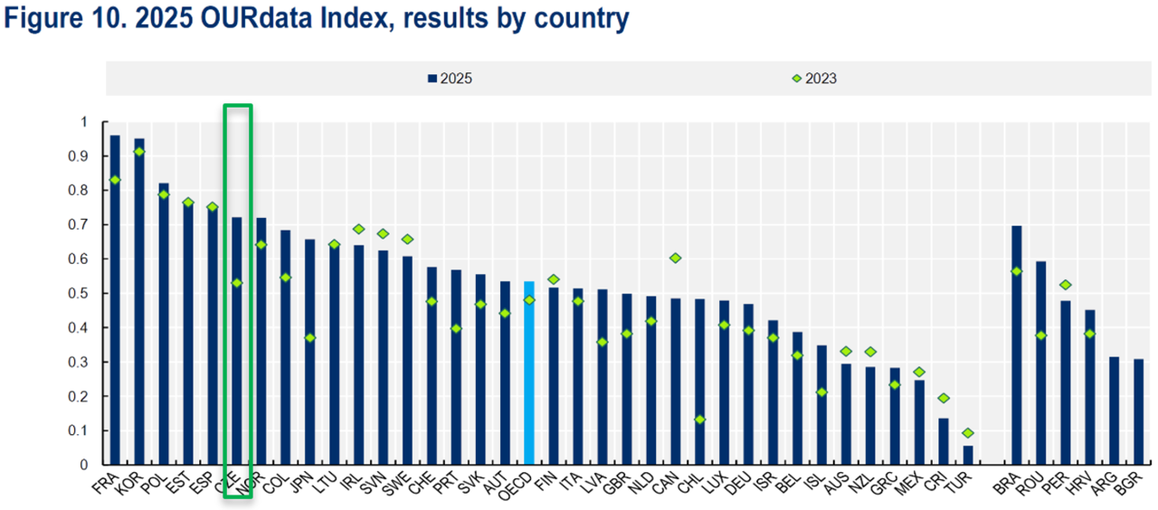 - Globální úroveň: 6. místo v OECD OURdata Indexu (skóre 0,72 oproti průměru 0,53).